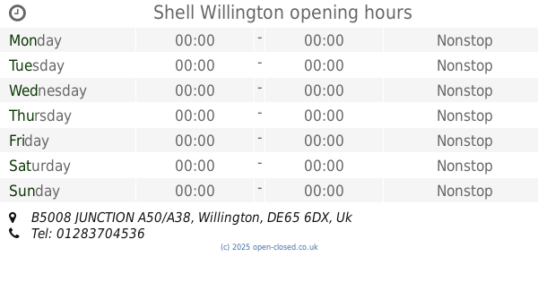 Add it to your website, your phone or even your desktop - opening times, phone numbers and the road to Station of the Shell In Willington, B5008 JUNCTION A50/A38.